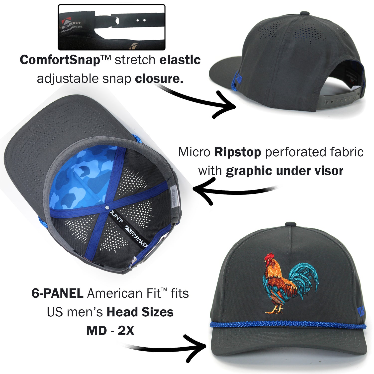 This Rooster hat is built on our Base Camp 5-Panel trucker hat style. The cock of the walk hat a structured front and a slightly curved visor and front rope. Constructed with lightweight micro ripstop performance fabric ideal for the outdoors, hiking, camping, and the outdoors. Our COMFORT SNAP™ snapback closure combines the stretch of elastic with the adjustability of a snapback, allowing for a custom stretch fit. Lastly, this chicken hat features our American™ Fit sizing that fits men’s US head sizes MD – XX.
